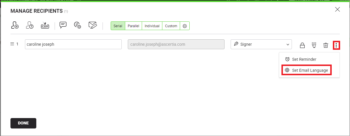 and select the "Set Email Language" option against the guest user recipient, to whom you want to send emails in the selected language.