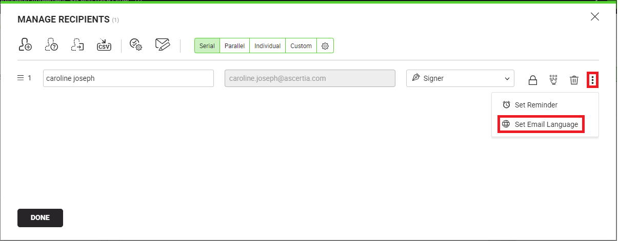 and select the "Set Email Language" option against the guest user recipient, to whom you want to send emails in the selected language.