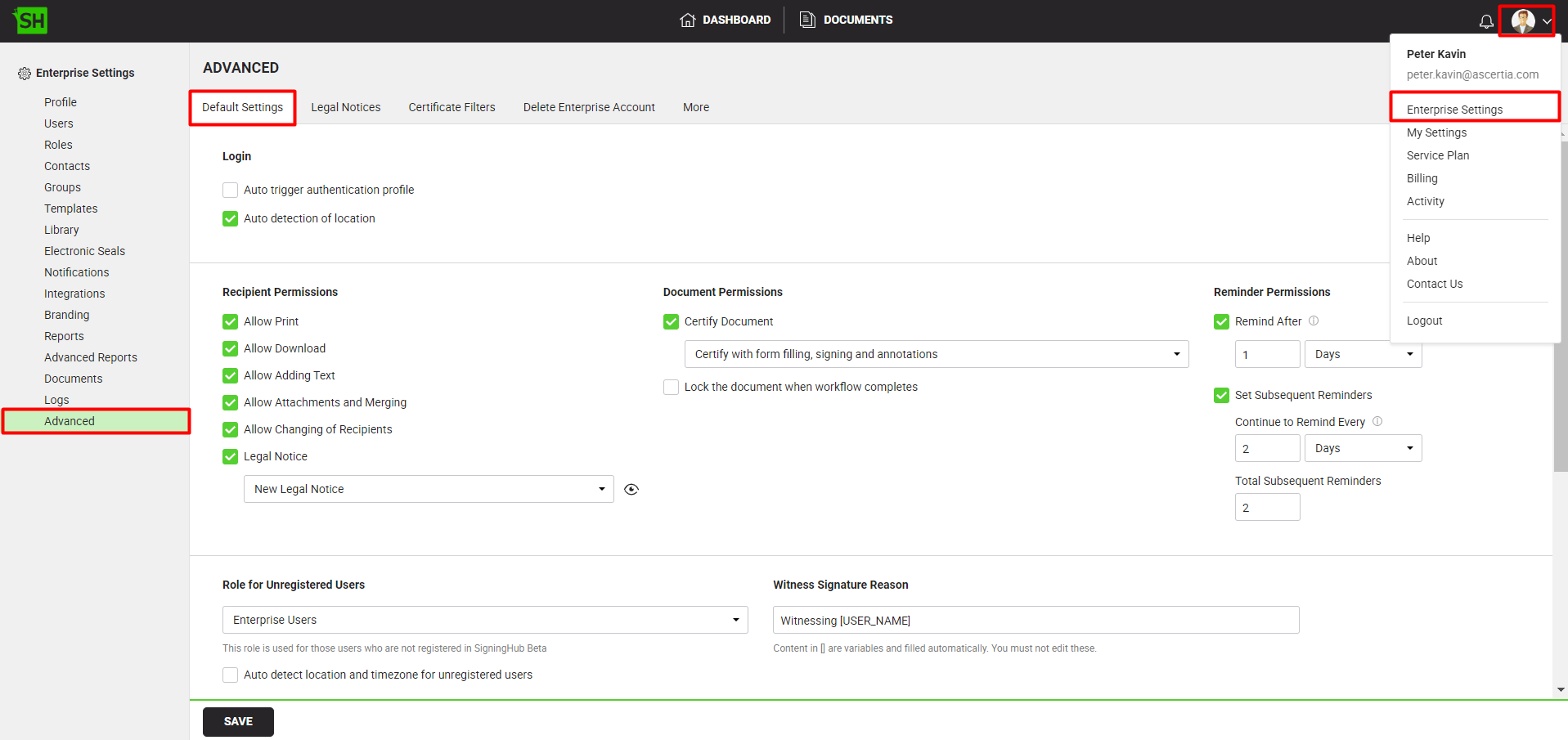 SigningHub allows you to configure default settings for your enterprise account.