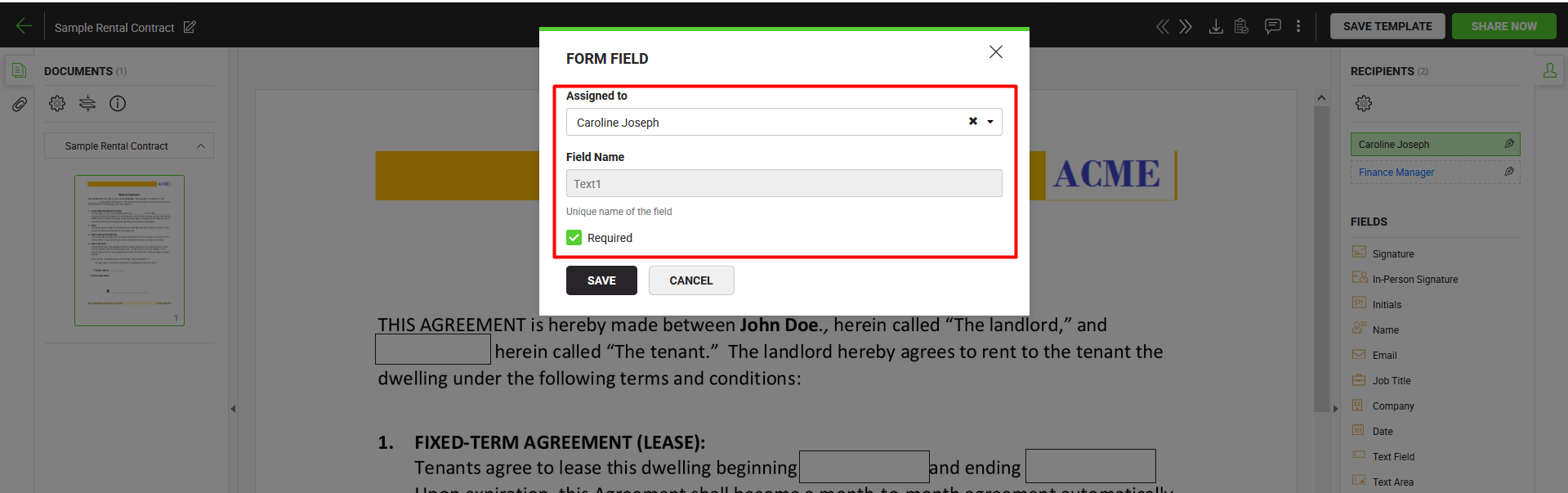 - Tick the "Required" option if you want SigningHub to enforce the recipient to fill in the field. Click the "Save" button.
