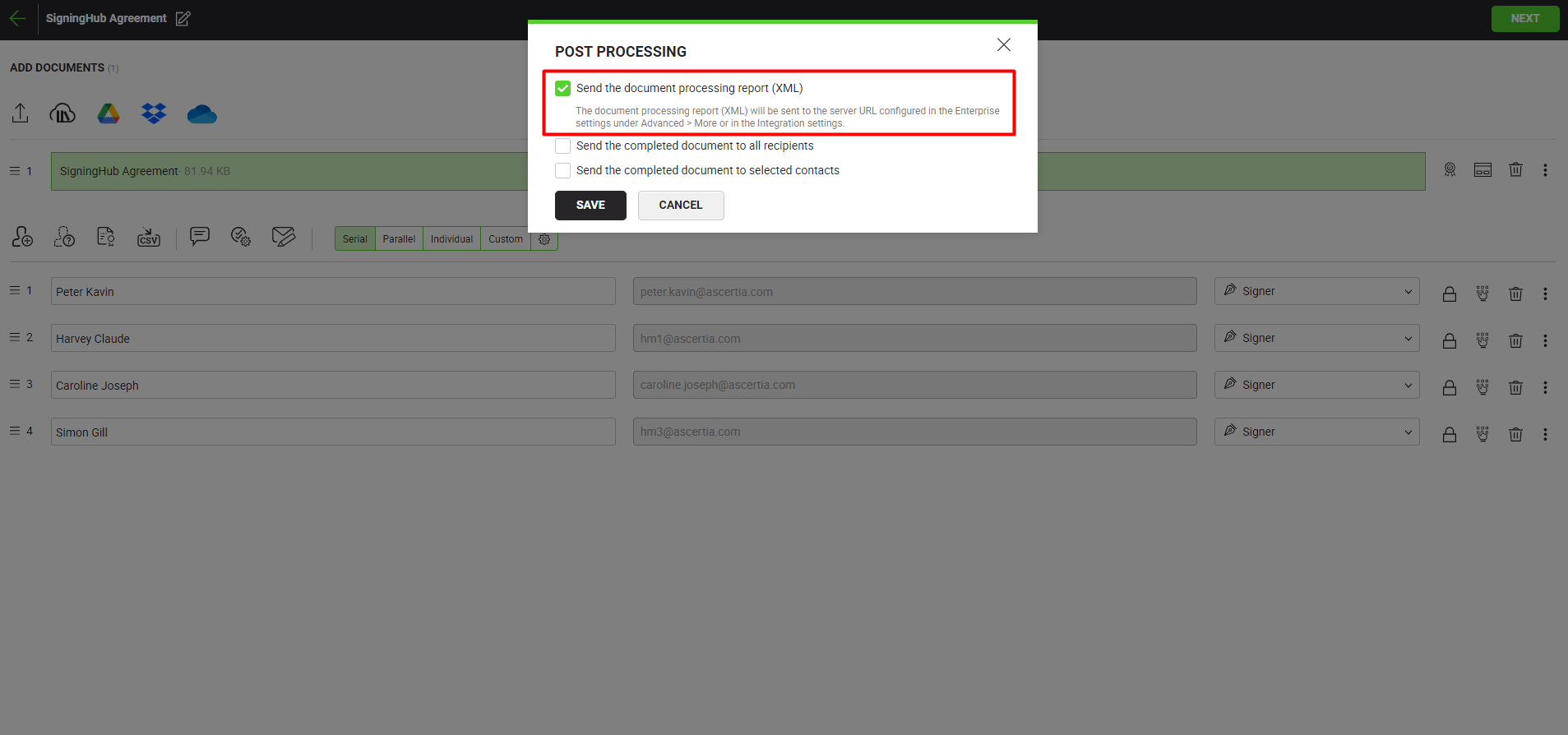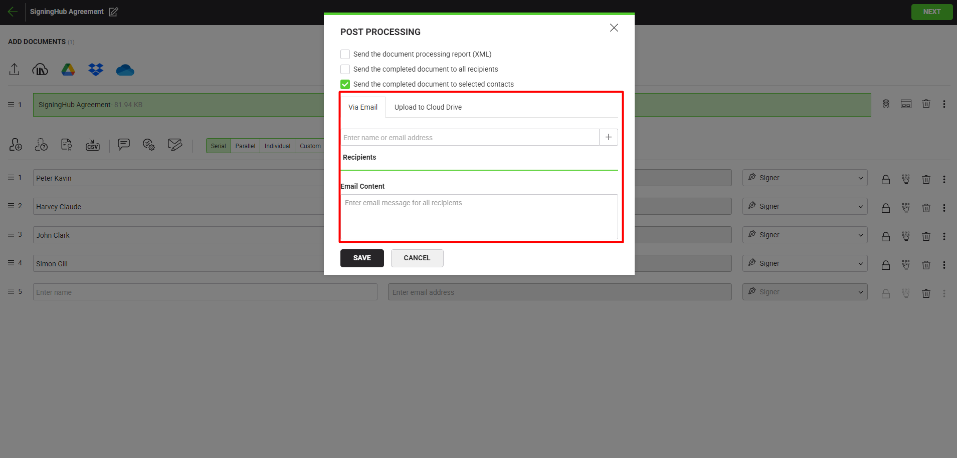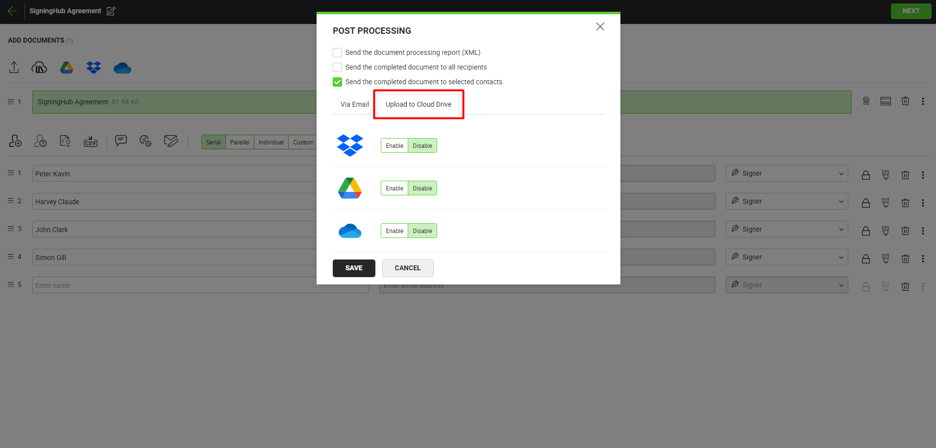 You can also configure SigningHub to send the completed documents to your cloud drives to save the allowed storage space of your SigningHub account.