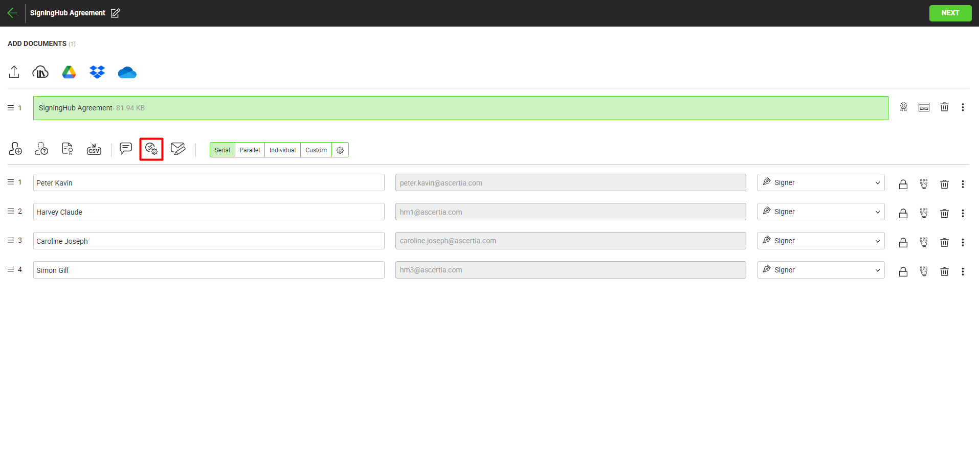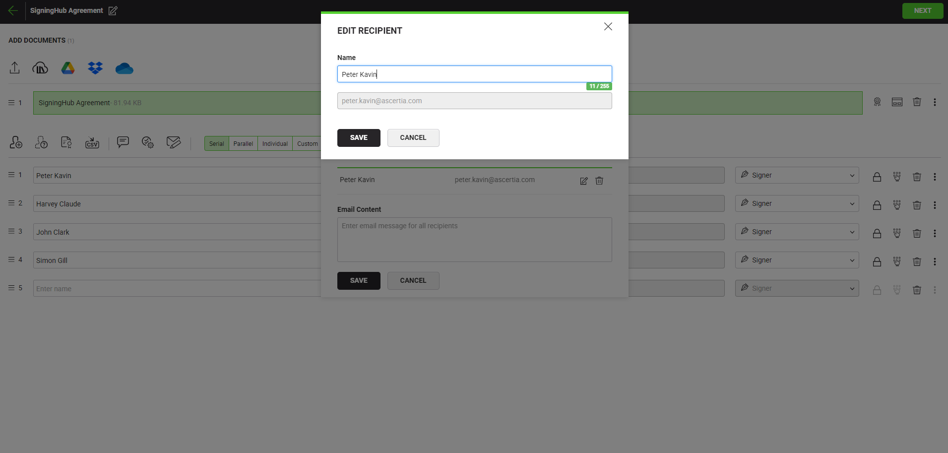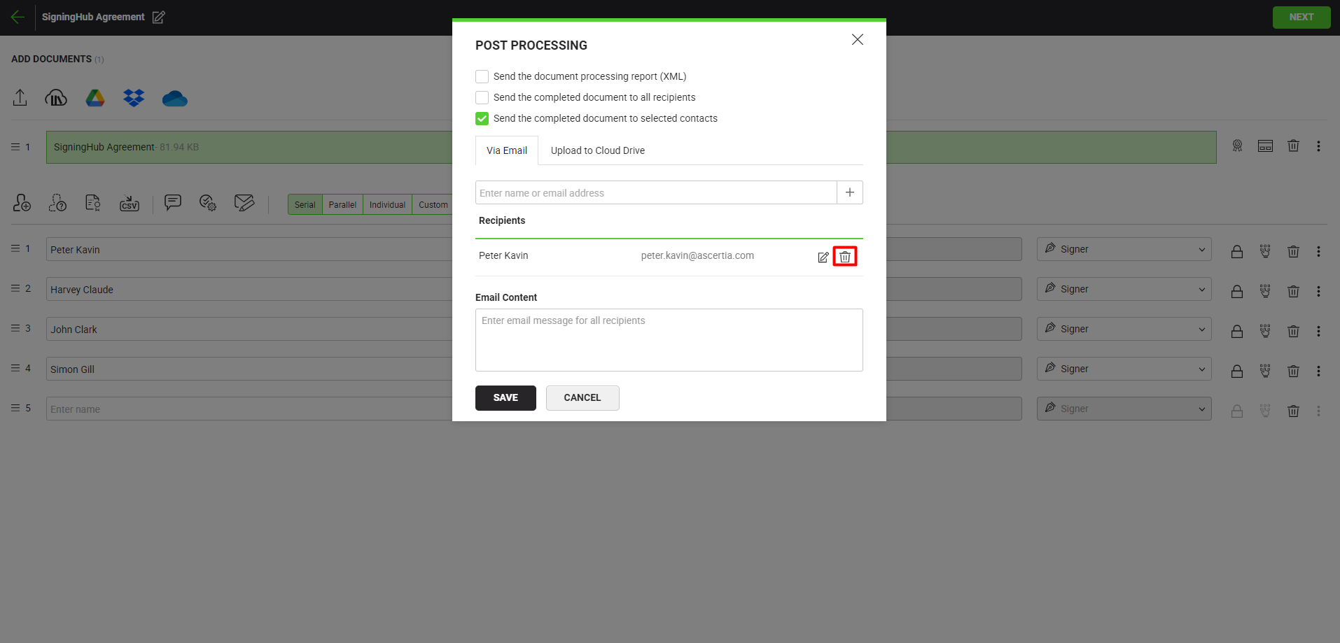 The document will be emailed to all the recipients, selected contacts, and/ or uploaded on the enabled cloud drives accordingly, when it is signed by all the recipients/ placeholders.