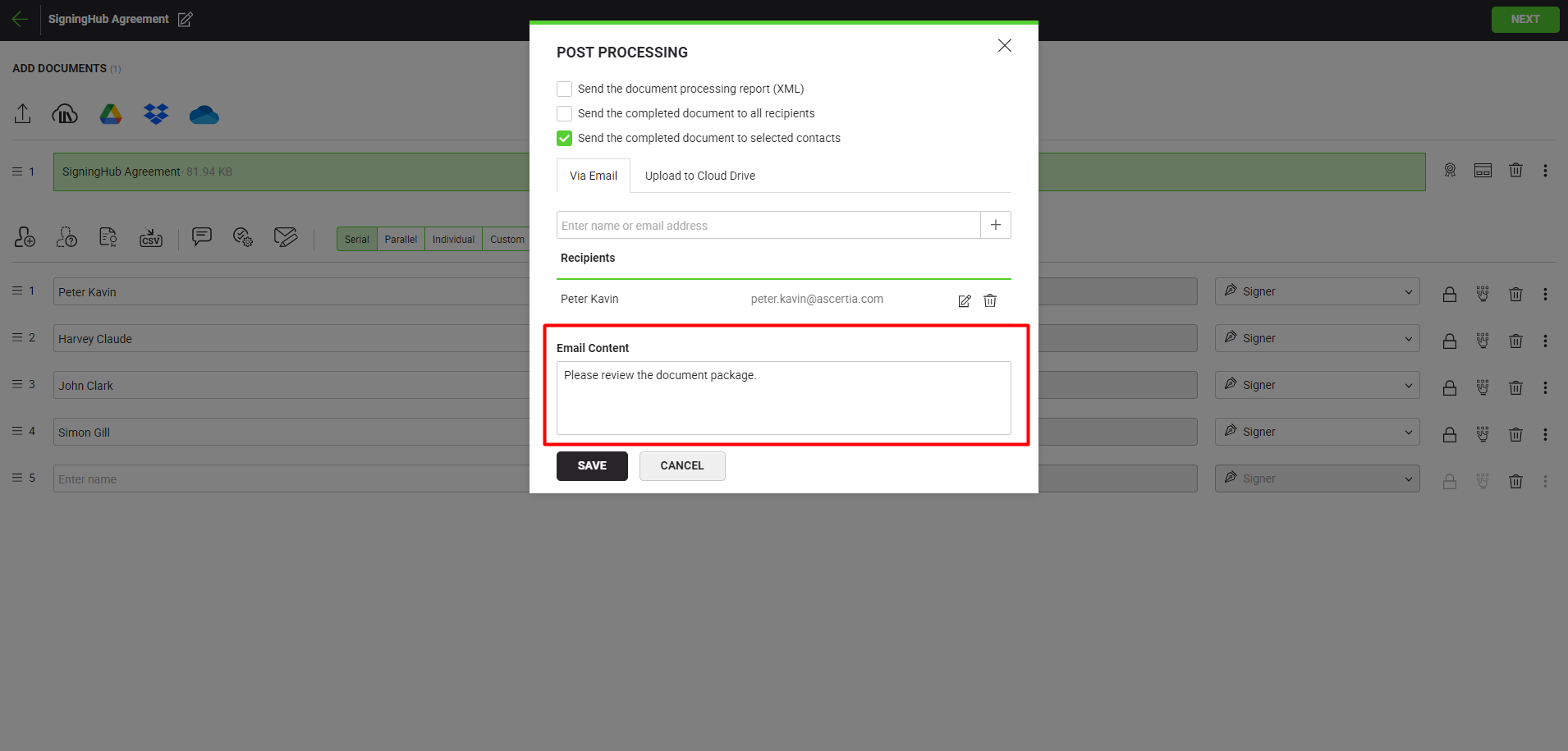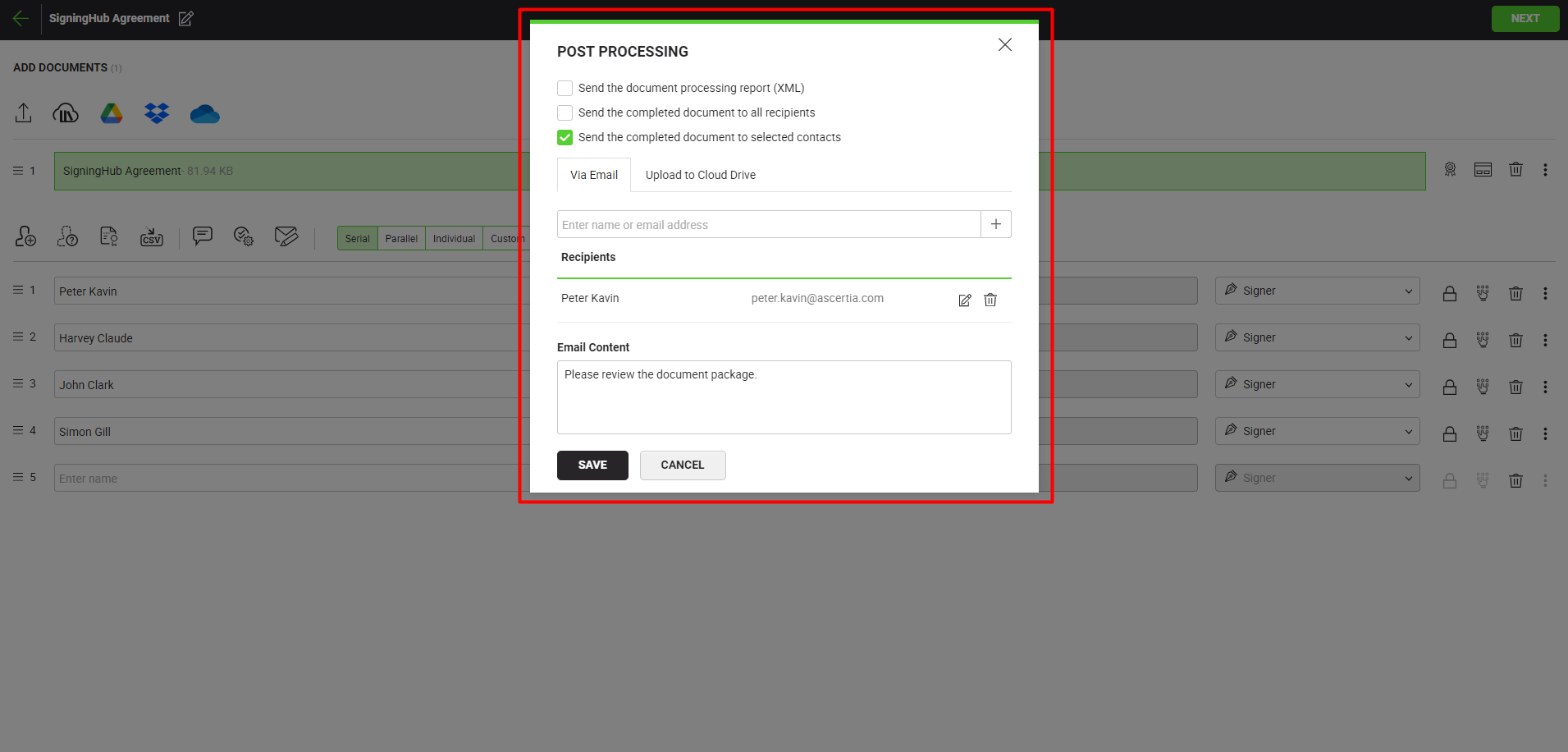 SigningHub gives you an option to configure your workflow to send the copy of completed document(s) to your choice contacts. This could be useful when a workflow document has got multiple owners, and/ or each stakeholder wants to have the final document copy after being signed by all the recipients/ placeholders.