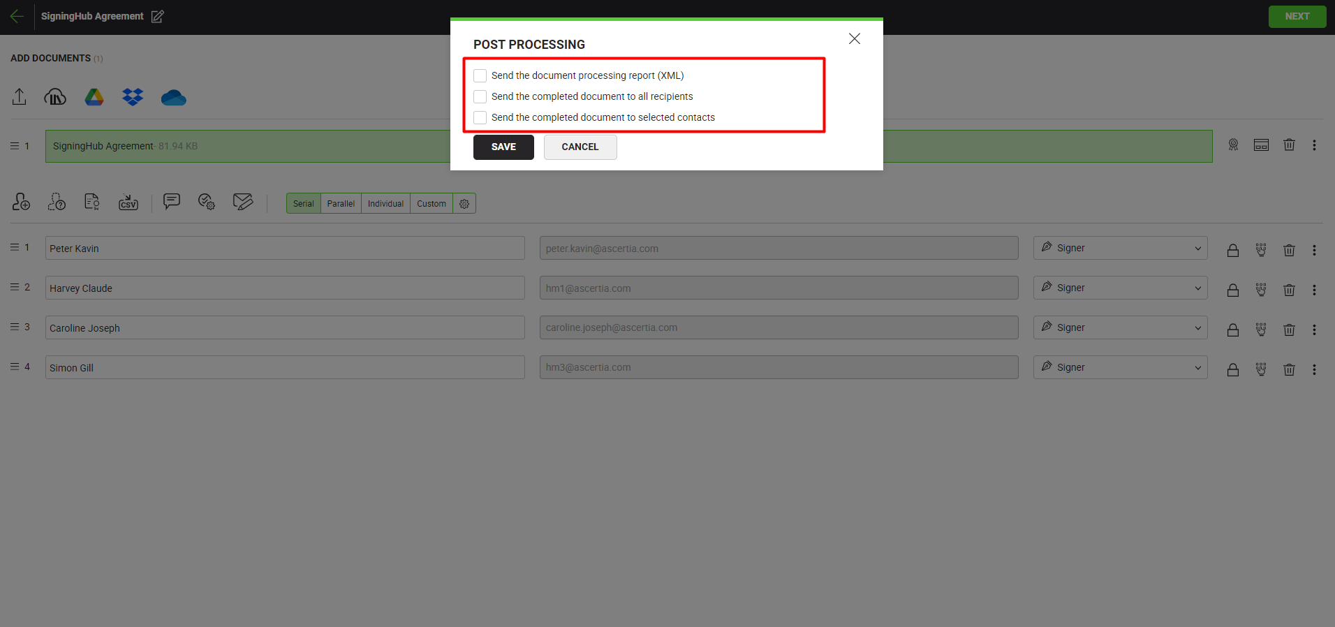 - From the "Post Processing" dialog, select the "Send the completed document to selected contacts" check box.