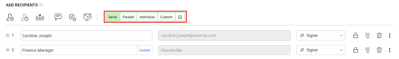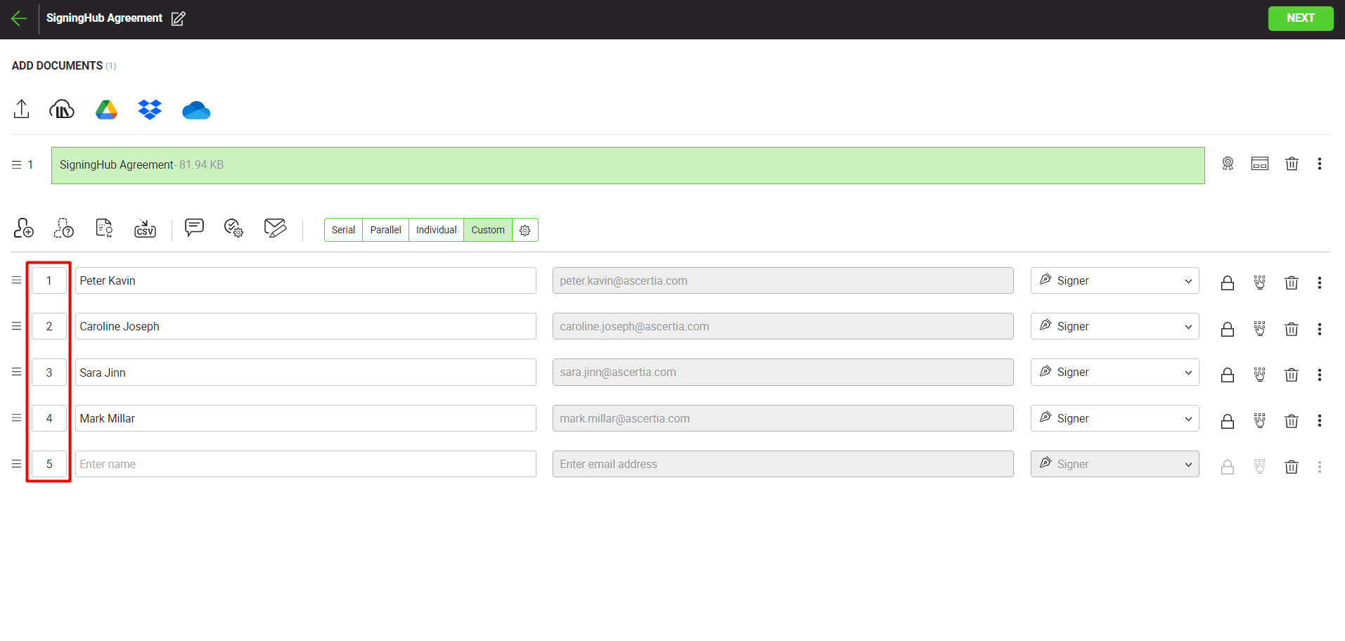 As defined above, a custom workflow can be a combination of serial and parallel workflows. It is triggered on the basis of specified signing order(s), see the red highlighted area in the below image. You can only provide a positive integer, which may or may not be in incremental order, e.g. 1, 2, 2, 3, 4, 4, 5 or 1, 2, 3, 3, 3 etc. The same numbers imply that signing order is parallel, while incremental numbers imply that signing order is serial.