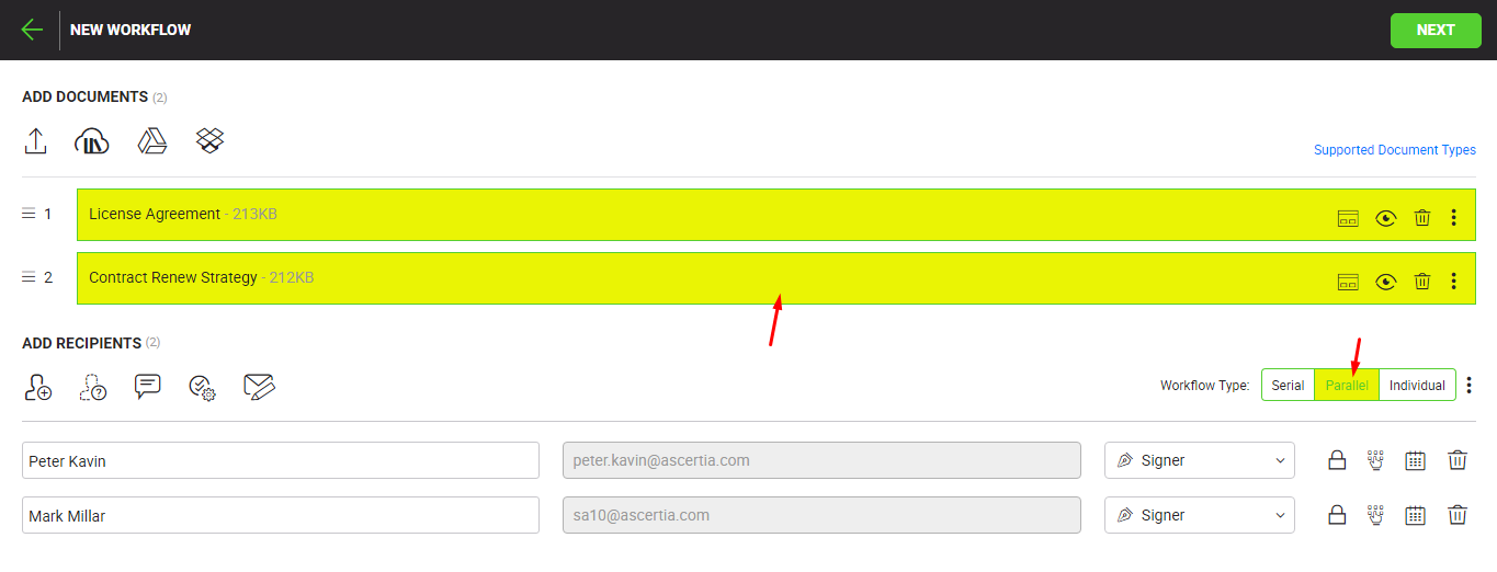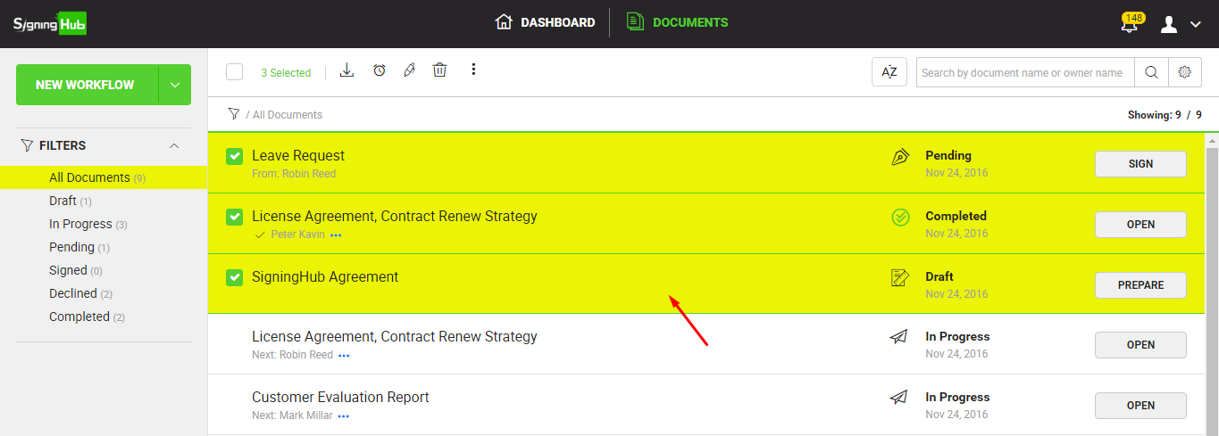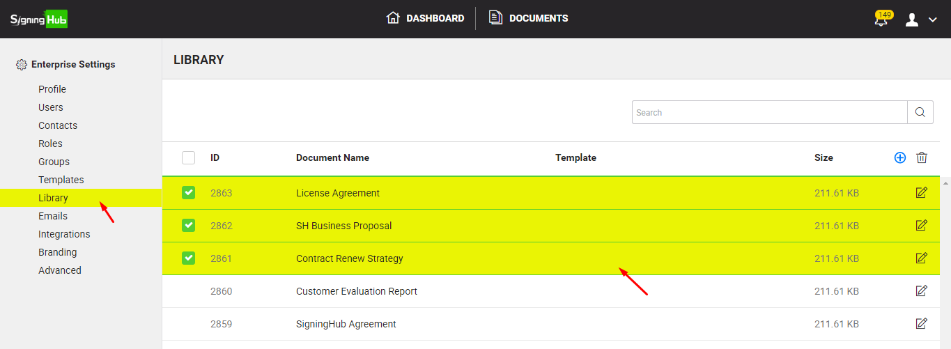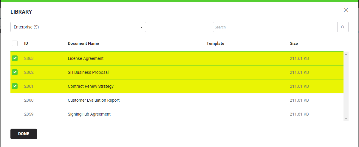 Selected documents from library on workflow screen