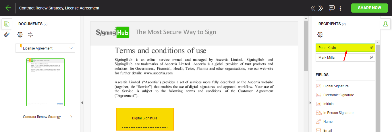 Selected recipient on document viewer