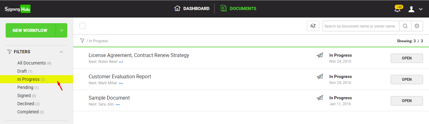 Selected filter on documents listing