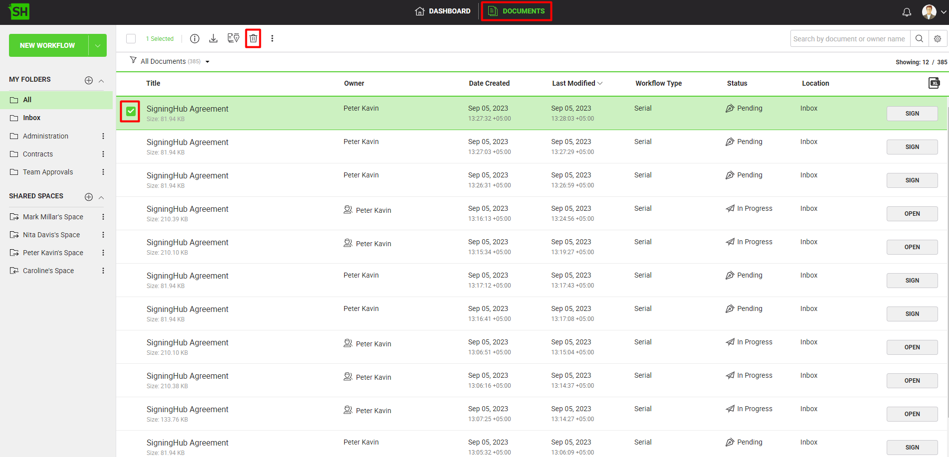 When you delete a document, it is purged from your SigningHub account and cannot be recovered again. You can delete any document(s) from your documents list, provided it is allowed in your role. But before deleting a document, you need to know the following considerations: