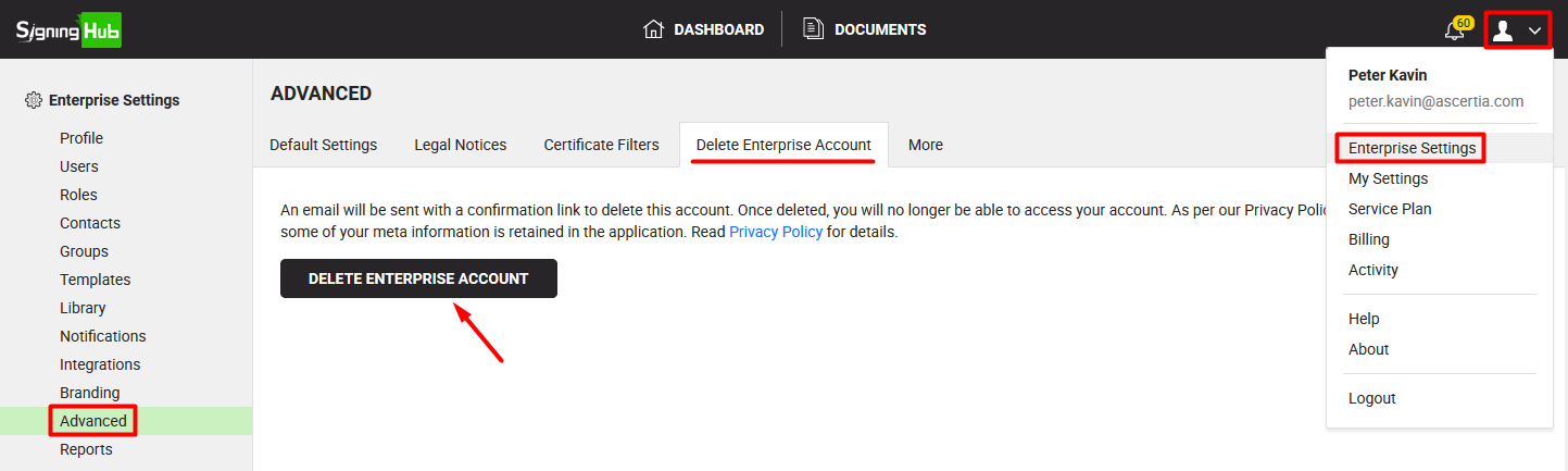 If you are still looking to remove your enterprise account from SigningHub, then you will have to manually delete all your enterprise users first. System not allow you to delete the account if any enterprise user exists in it, except the enterprise owner.