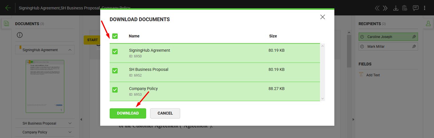 - If the package is comprised of a single document, then it is downloaded to your local Downloads folder. However if there are multiple documents, you will be prompted to select the documents you wish to download. Select the required documents and click the "Download" button.