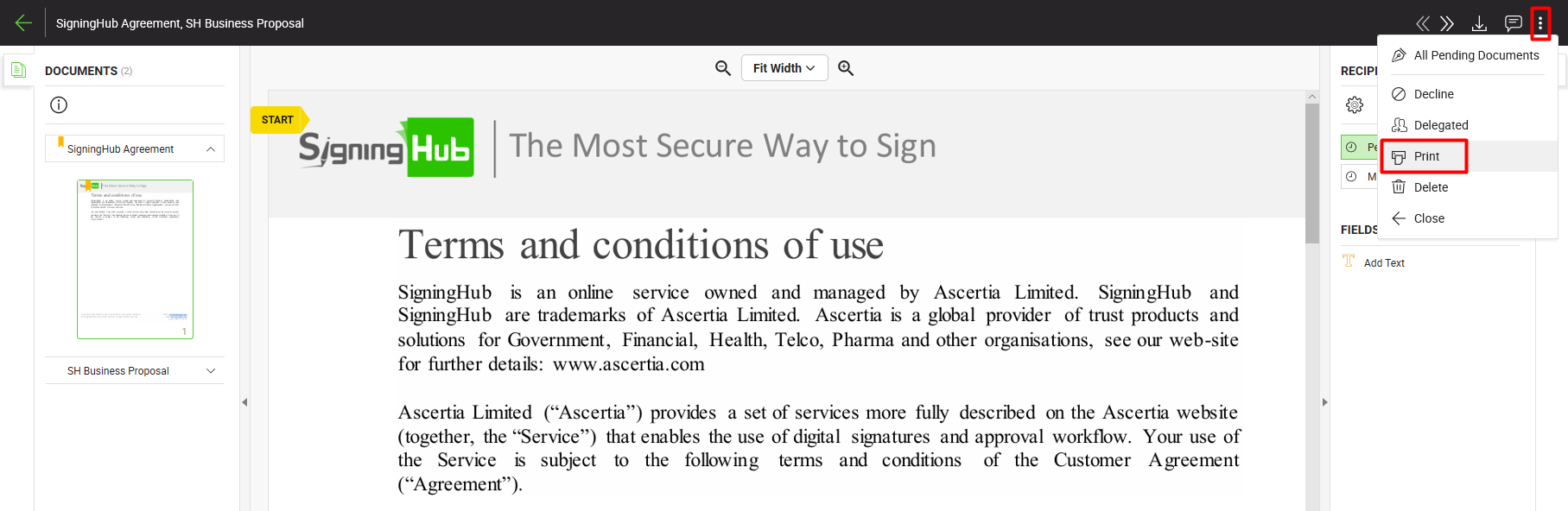 from the right of document viewer header, and select the "Print" option.