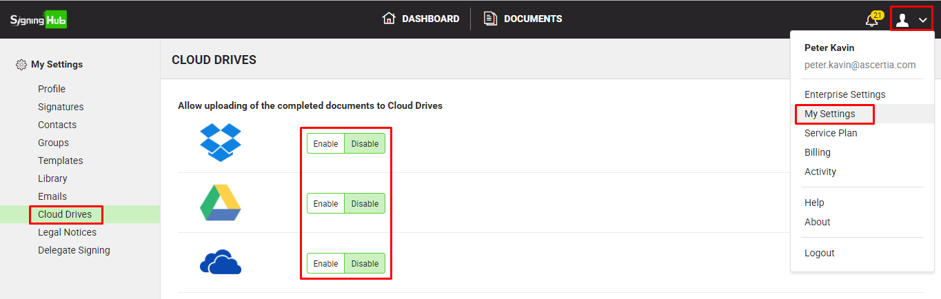 SigningHub gives you an option to use your choice cloud drives for keeping the copies of your completed documents and save the storage space of your SigningHub account. The enabled cloud drives from here, will be available to you while: