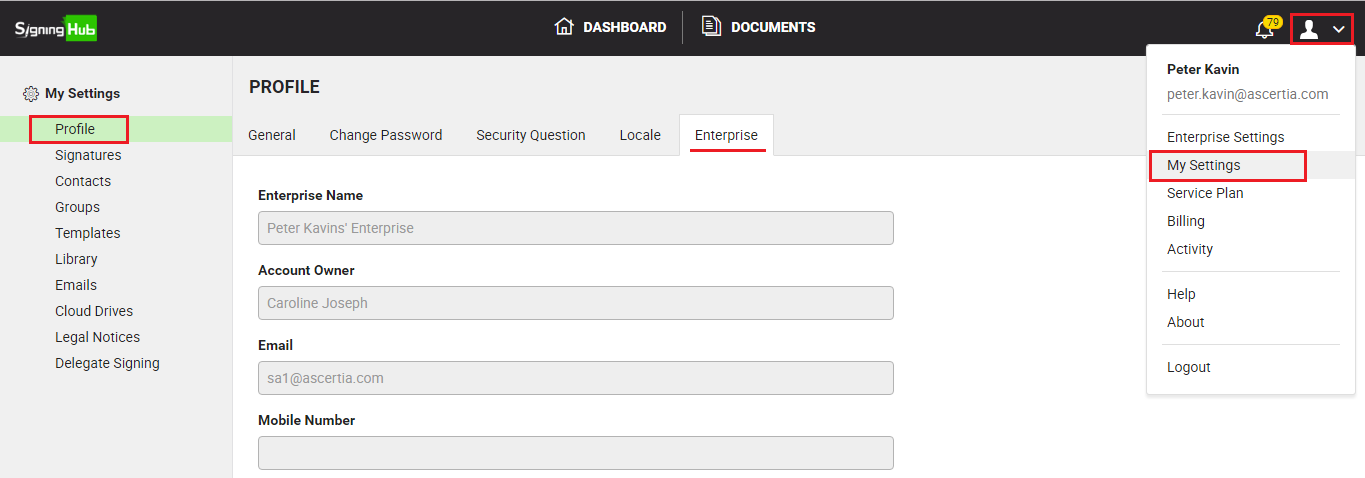 In case you are logged in as an enterprise user, SigningHub lets you view your enterprise information in read-only mode. In this regard, you can view your enterprise name, enterprise account owner name, their email address and their mobile number.
