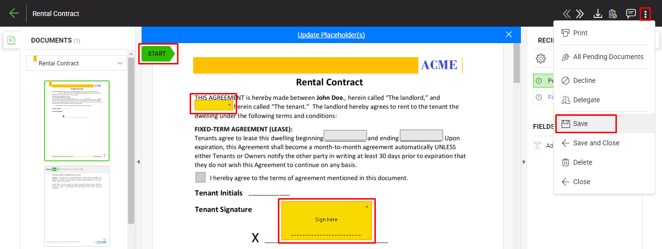 from the right of document viewer header, and select the "Save" option to save the filled in data. You can edit the field's data, as far as the document is not signed. Once the document is signed, the fields data will become the permanent part of the signed PDF document.