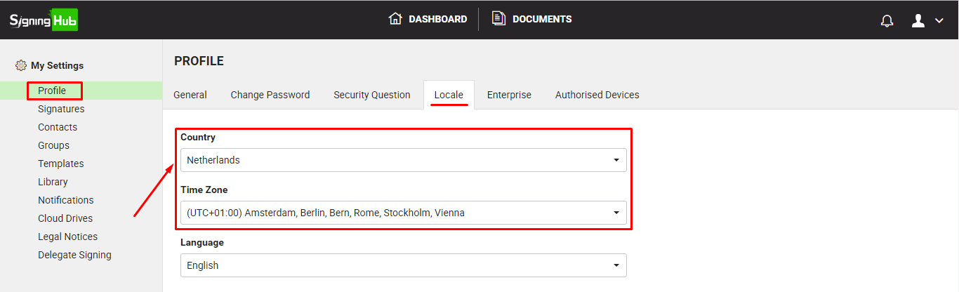SigningHub will also change your time zone accordingly. You can confirm these changes from the "Locale" tab of your Personal Profile.