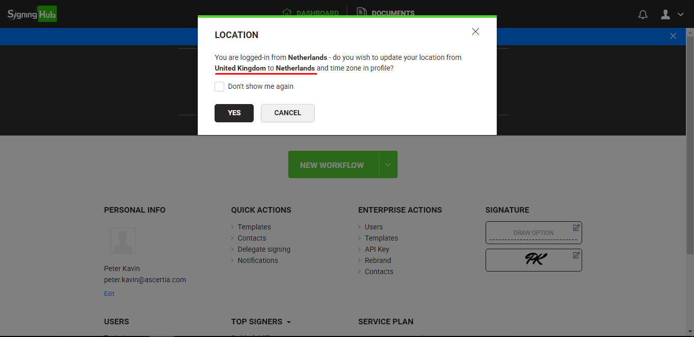 However when you login from a new country, SigningHub will prompt you about the detected change in your location and will ask whether you want to save it in your profile or not.
