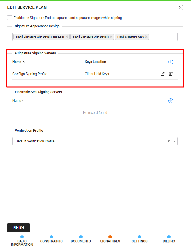 - Select and add the earlier configured Signing Profile, in a service plan in SigningHub Admin, as shown below: