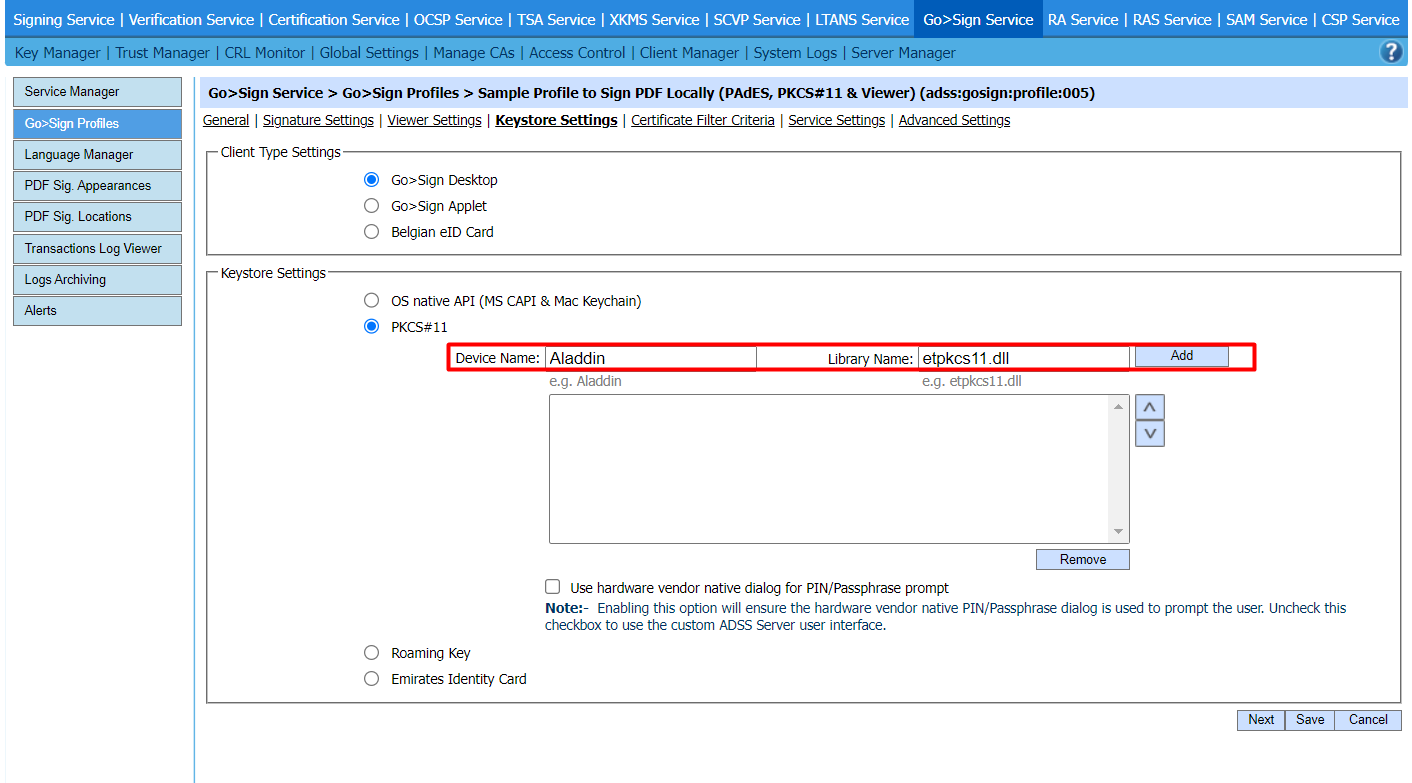 - If you want to sign documents using the certificates from your HSM token, check the "PKCS#11" option. Copy and paste the sample "Device Name" and the "Library Name" in their respective fields, and click the "Add" button.