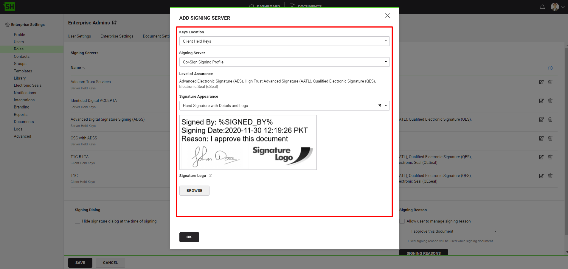 - Against your user role, in the "Signature Settings" tab, add the signing server.