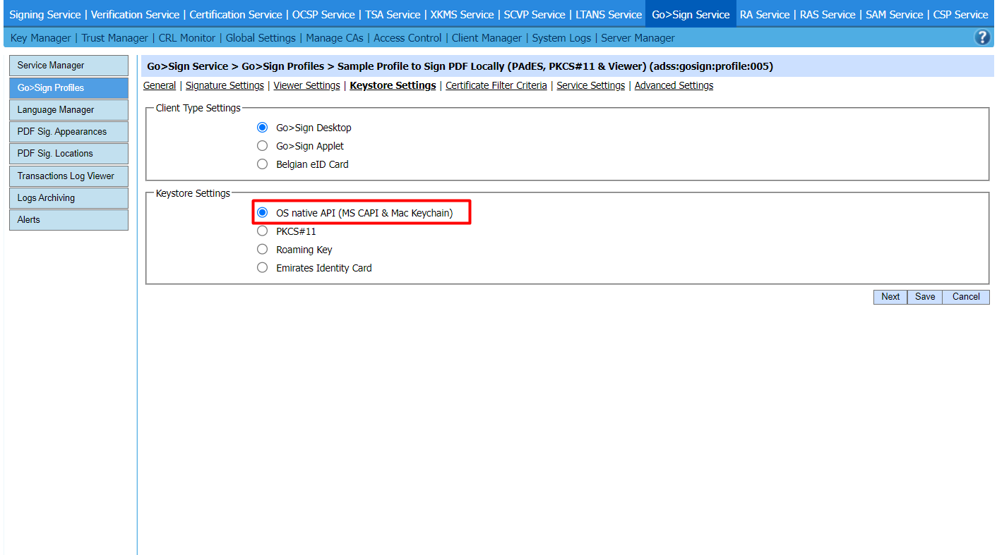 - If you want to sign documents using the certificates installed on your local machine, check the "OS native API (MS CAPI & Mac Keychain)" option.