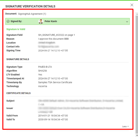 and select "Signature Verification" to view the"Signature Verification" details. The signatures are verified through the ADSS verification service.