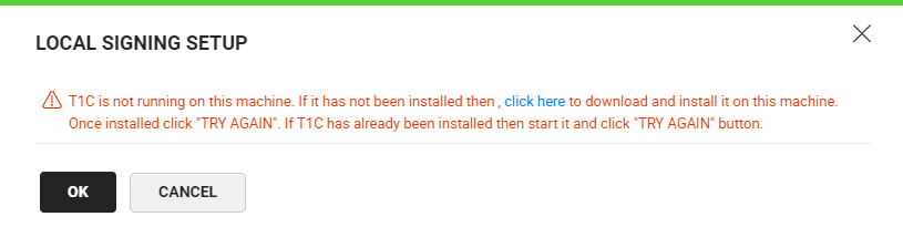 SigningHub supports performing local side signing with Trust1Connector (T1C). For this, SigningHub needs to be registered with the T1C platform and a T1C connector needs to be created in SigningHub to allow SigningHub to connect with the T1C app. The T1C app has to be installed on your local machine and the related HSM is attached to it while signing. Also, you should have full rights on the Trust1Connector service running on your machine. SigningHub will prompt you if any of the above-mentioned prerequisite is missing.