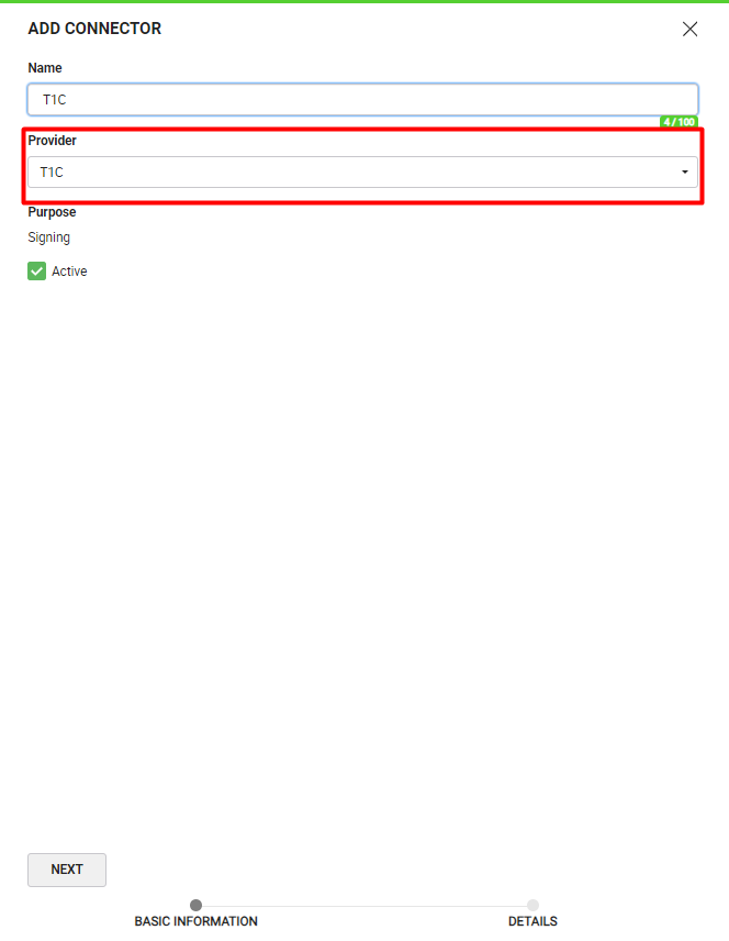 - In the "Basic Information" section, choose "T1C" as the "Provider".