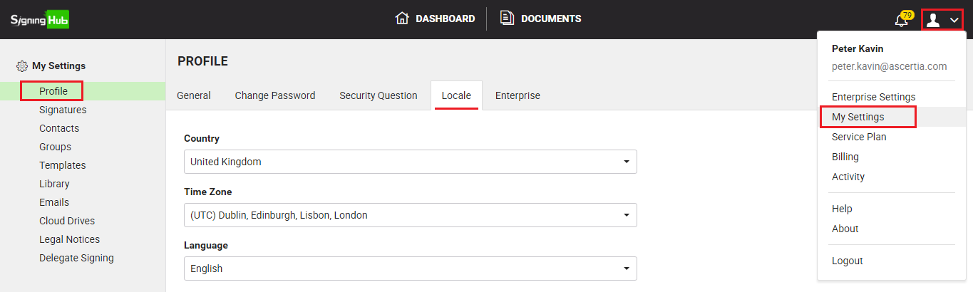 SigningHub recommends to specify your regional information, so that your account configurations can be customised according to your geographical location. Once specified, SigningHub will start manipulating your document transactions according to your time zone, and will change the entire interface into your language.
