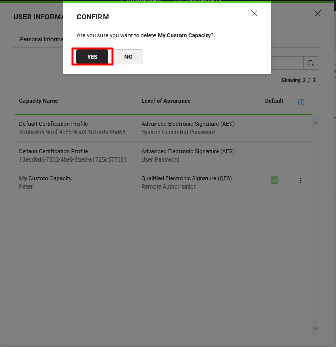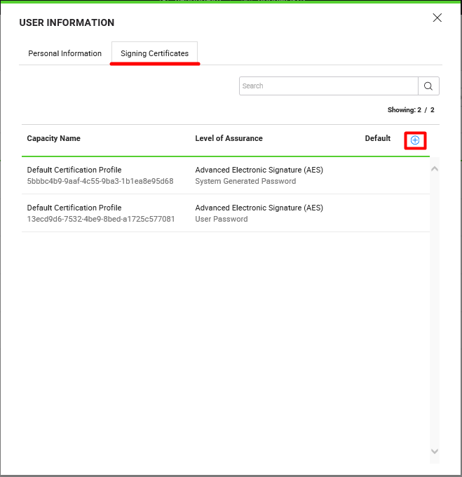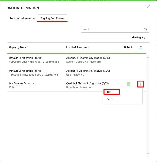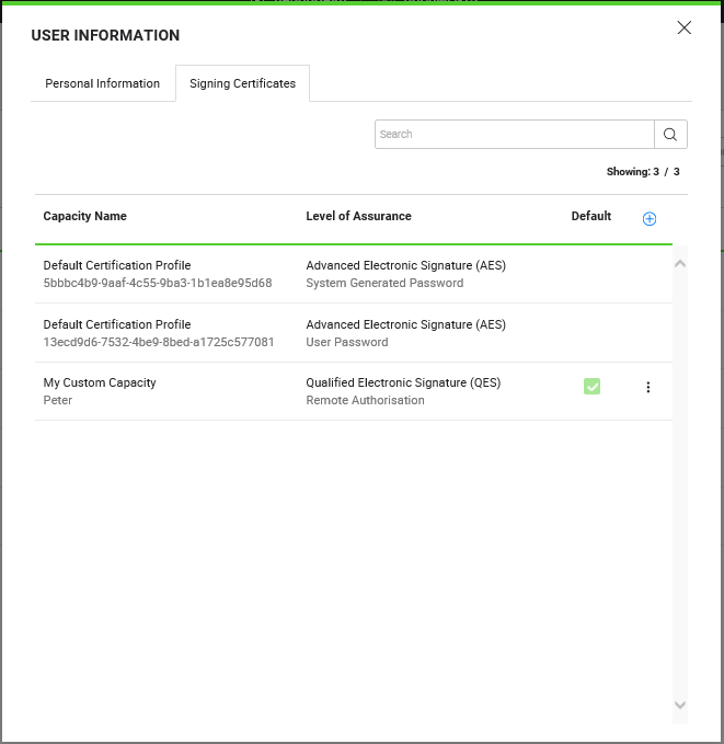- You can update Capacity Name, Certificate Alias, Certificate (CER) and Level of Assurance for your certificate. Click on the Set as default option if you want to display your certificate as selected by default in the signing dialog.