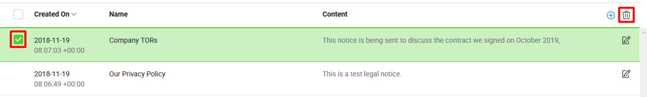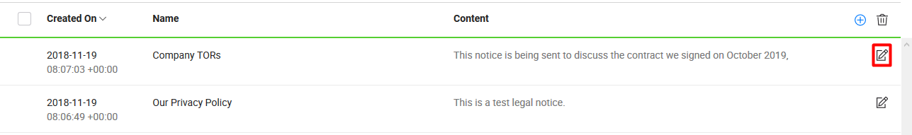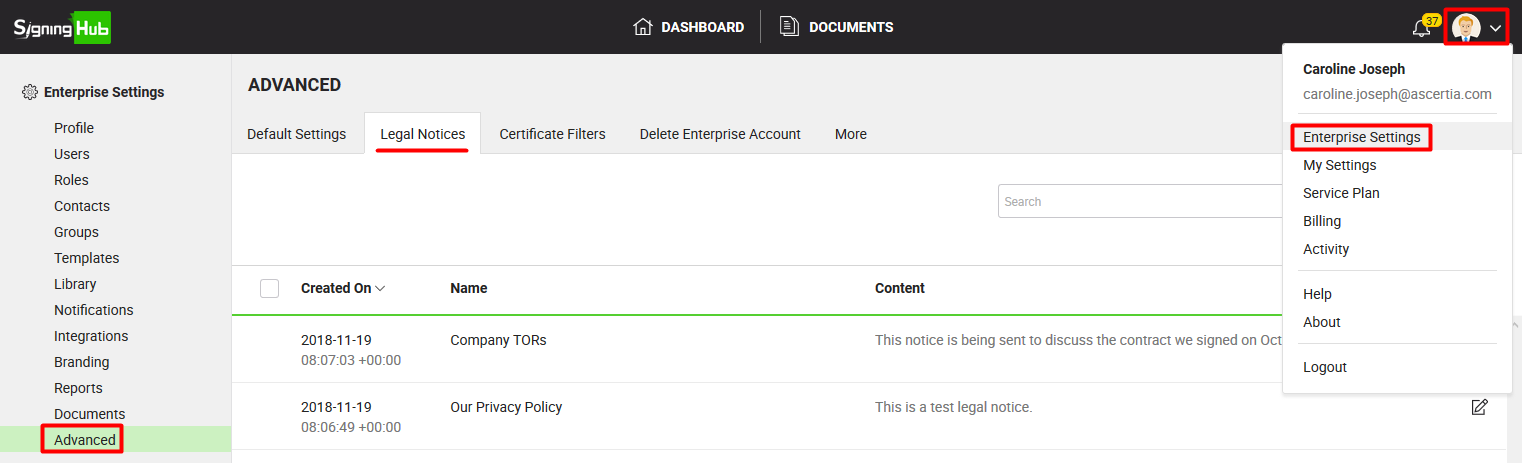 - Click the "Legal Notices" tab. Your existing enterprise legal notices will be listed.