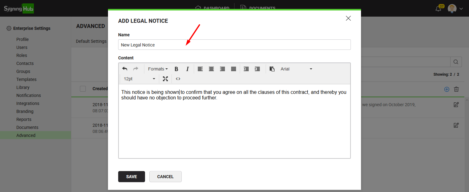 SigningHub enables you to manage (Add, Edit, and Delete) enterprise legal notices. These legal notices will be available to all the enterprise users within your enterprise, when they configure recipients in a workflow.