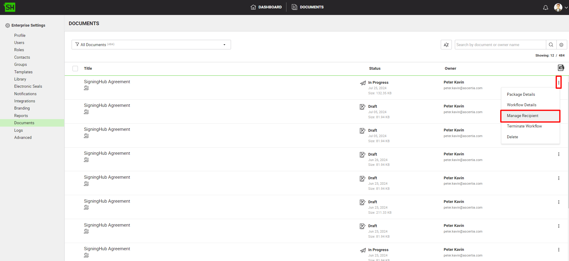 All the document packages within your enterprise will be listed in their respective statuses. - Search/ move to the 'In-Progress document package' whose recipient you want to change. Click