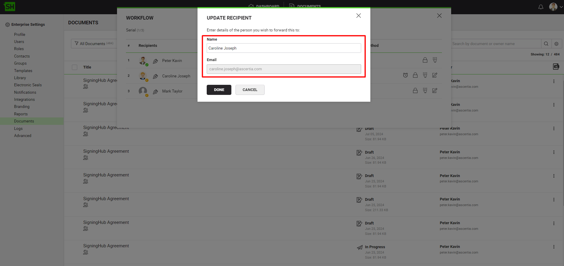 When an In-Progress workflow has reached a stalemate in your enterprise because the next configured recipient is unresponsive, SigningHub gives you authority to either: