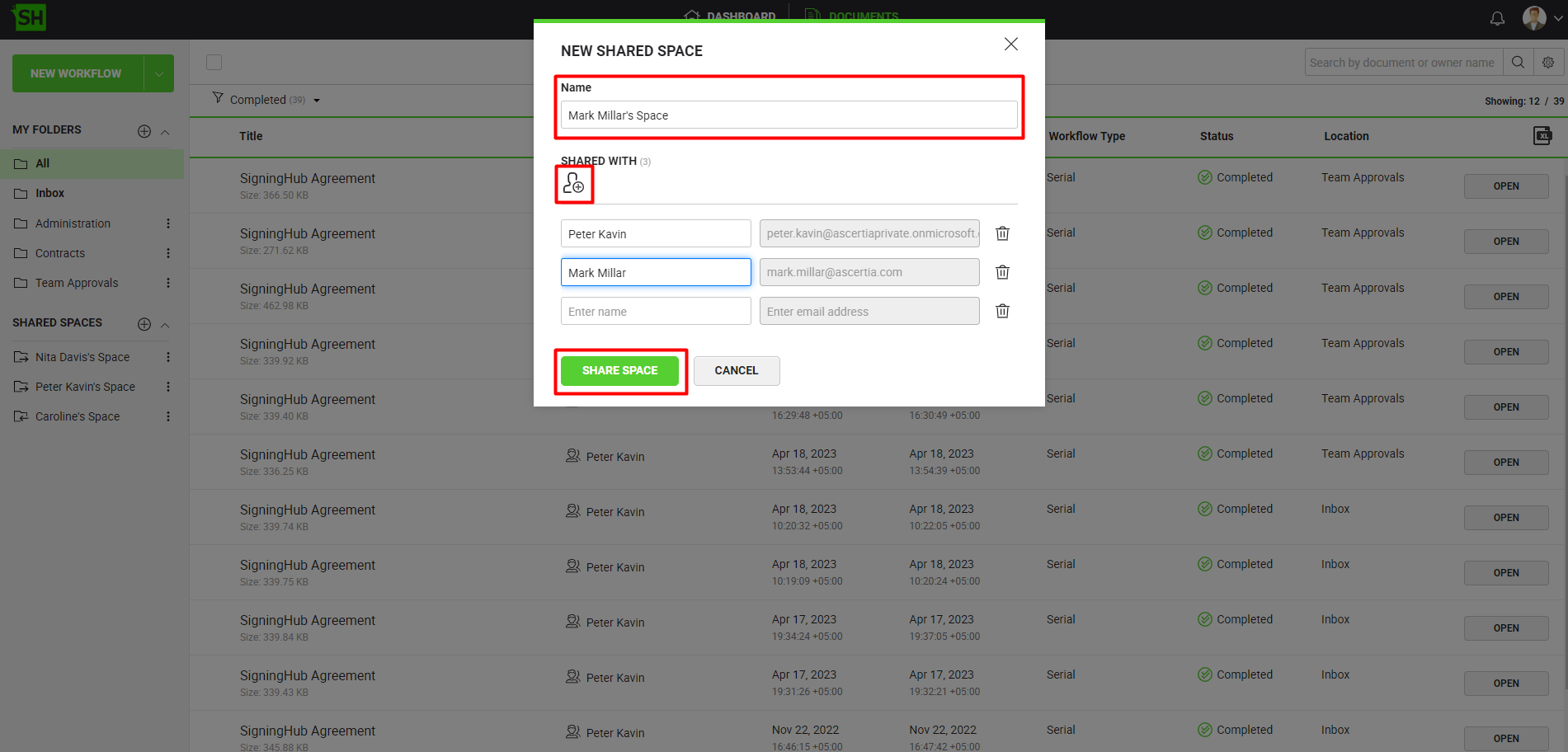 - They can add their choice collaborators in their shared spaces, who can process their workflow documents on behalf of the space owner.