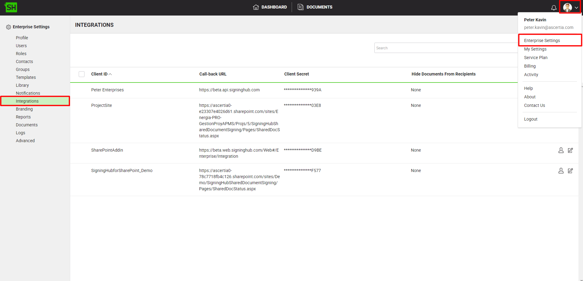 You can integrate multiple web applications with your enterprise account. For details, see the Quick Integration guide and visit Ascertia's Partner Portal for API Guide.