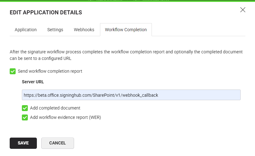 Send workflow completion report Select to automatically post the workflow reports of the integrated application (in XML format) to the configured address when the workflow completes. This applies to all users within your integrated application. When enabled, the "Server URL" and "Add completed document in report" fields are displayed as shown in the image below.