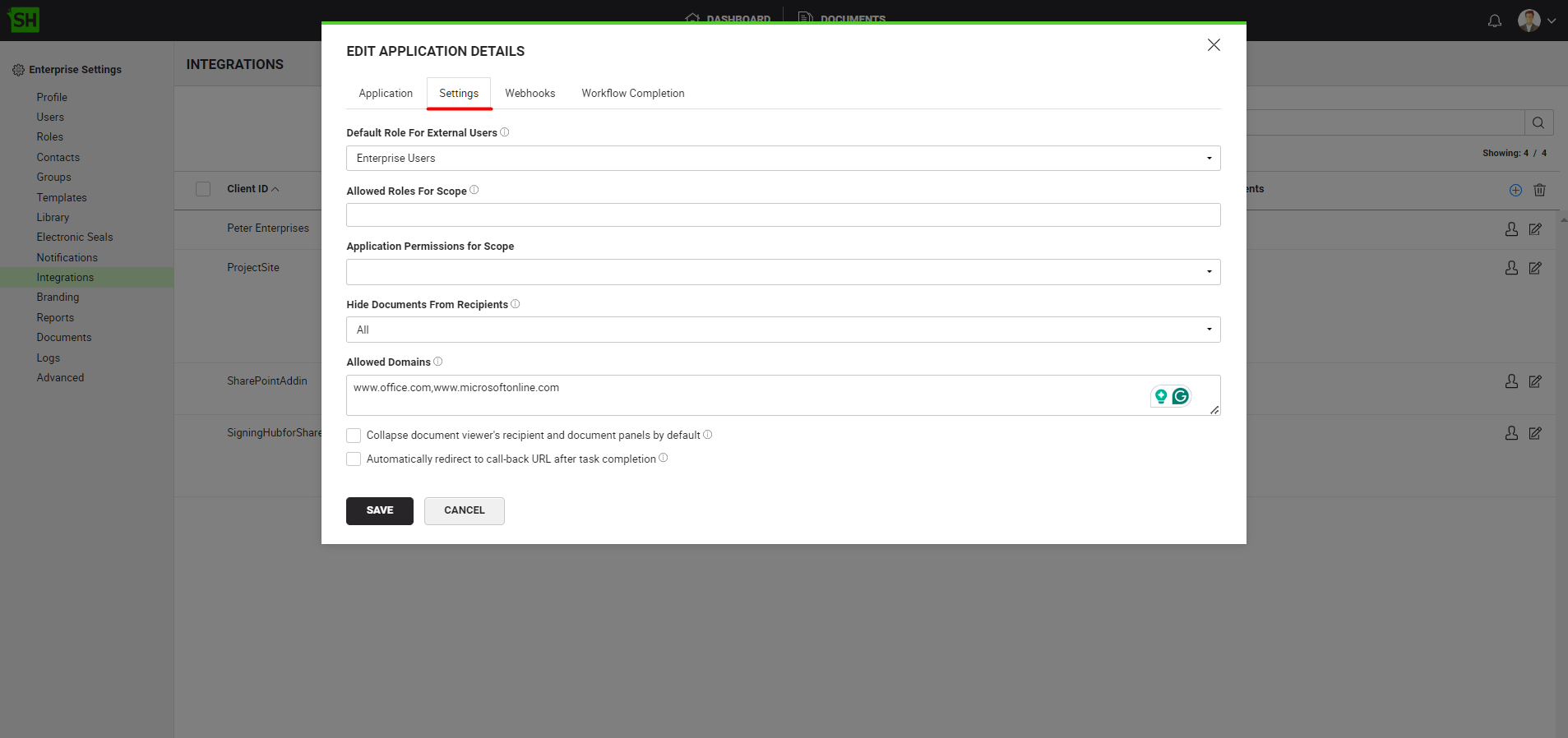 In this way when your enterprise document is shared with an external user through this integrated app, and they (external user) also sign it through this integrated app, SigningHub will supersede their personal/ enterprise signature settings with the ones defined in this role at the time of signing.