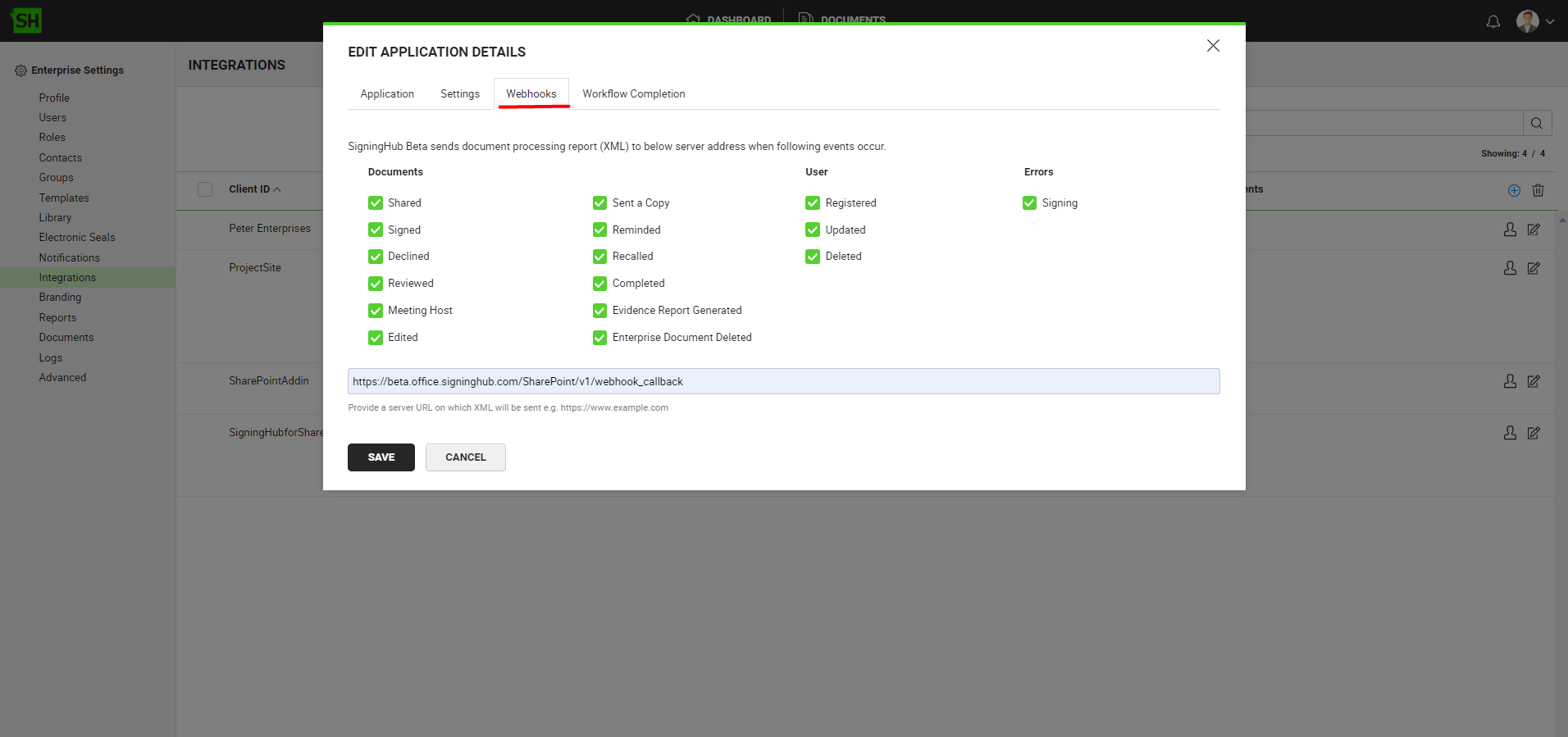 - The system will only send the webhooks and the workflow completion report, if both the document owner and the recipient belong to the same enterprise.