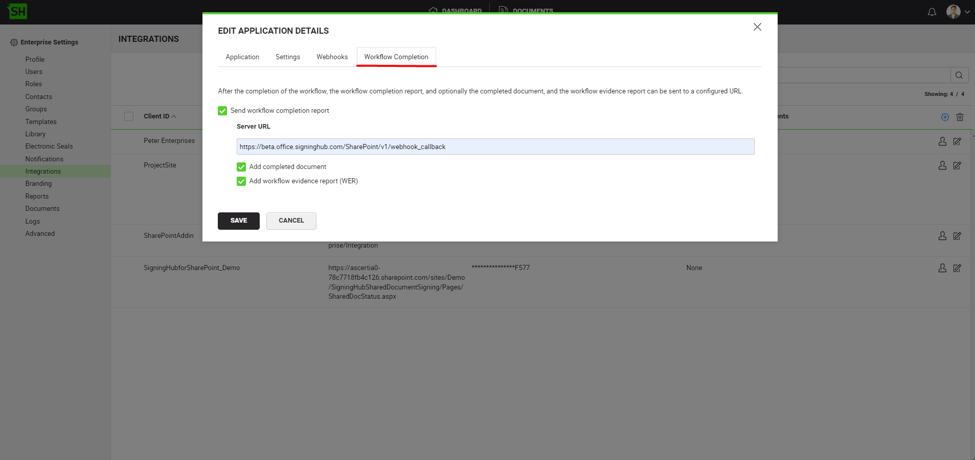Webhooks and the Workflow Completion Report are configured in the integration settings of the recipient's enterprise