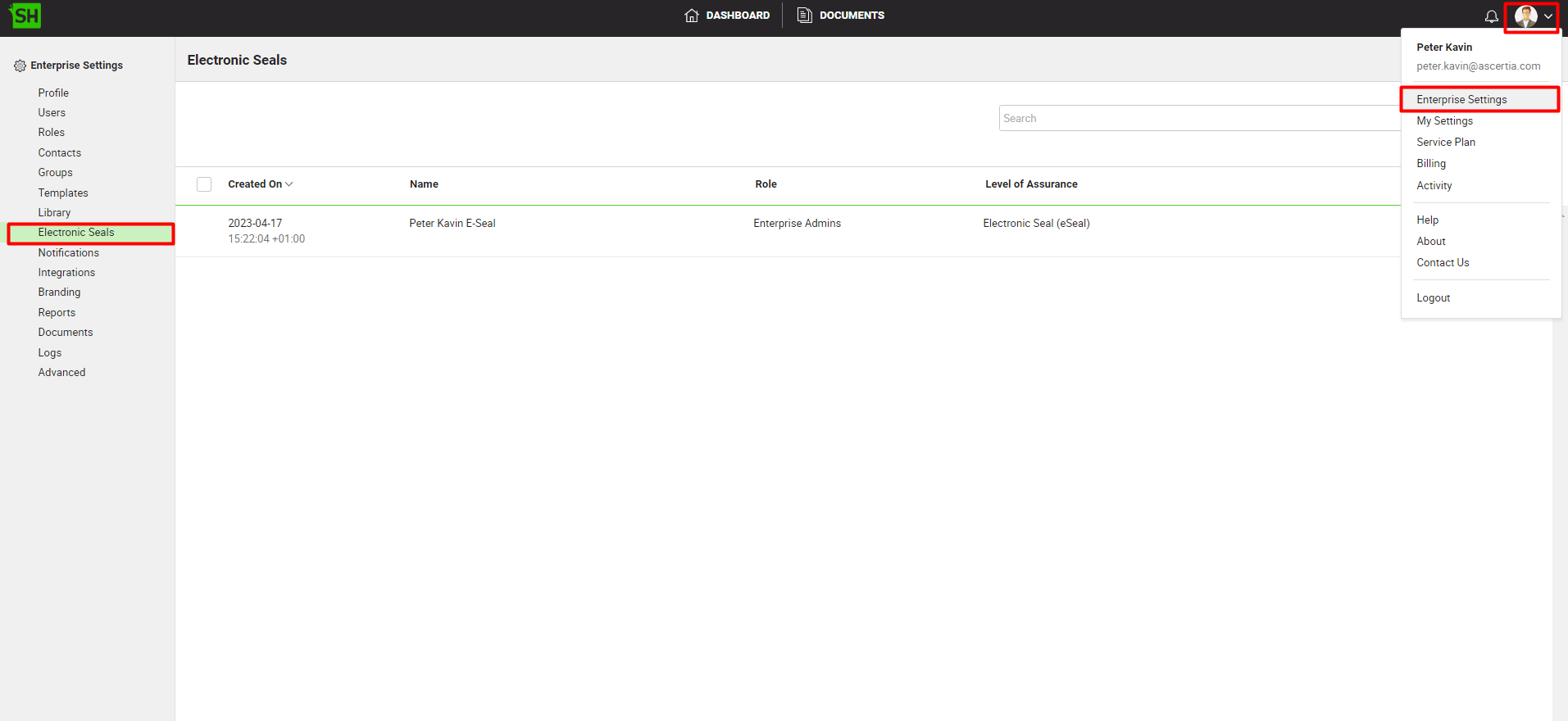 The "Electronic Seals" section will appear if "Electronic Seals" is enabled, as a featured, in the service plan.
