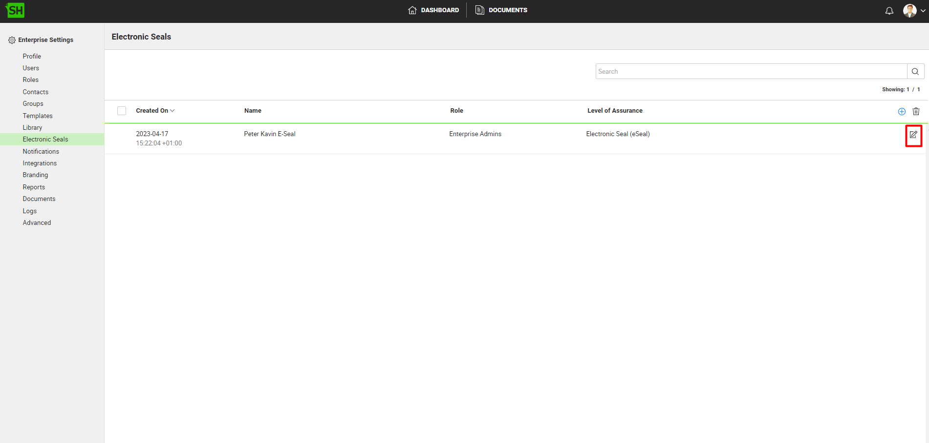 SigningHub enables you to manage (Add, Edit, and Delete) the Electronic Seals of the enterprise. These enterprise Electronic Seals are available to the enterprise users within your enterprise, based on their role, when they need to add an electronic seal to a workflow.
