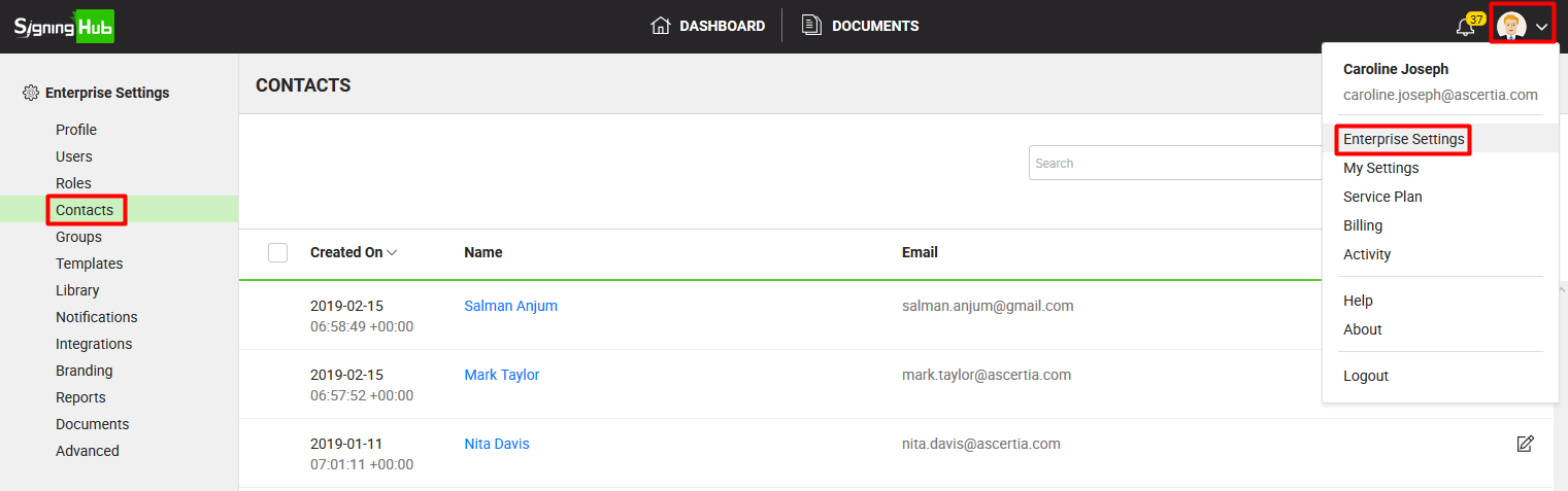 SigningHub enables you to manage (Add, Edit, and Delete) a list of enterprise contacts to help make sending documents even easier. These enterprise contacts are available to all the enterprise users within your enterprise, when they need to add recipients in a template and/or in a document workflow. Also, when a new enterprise user's account is activated, s/he is automatically added in the enterprise contacts by SigningHub.