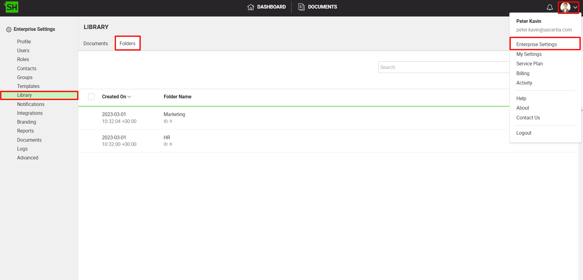 View your enterprise library document folders