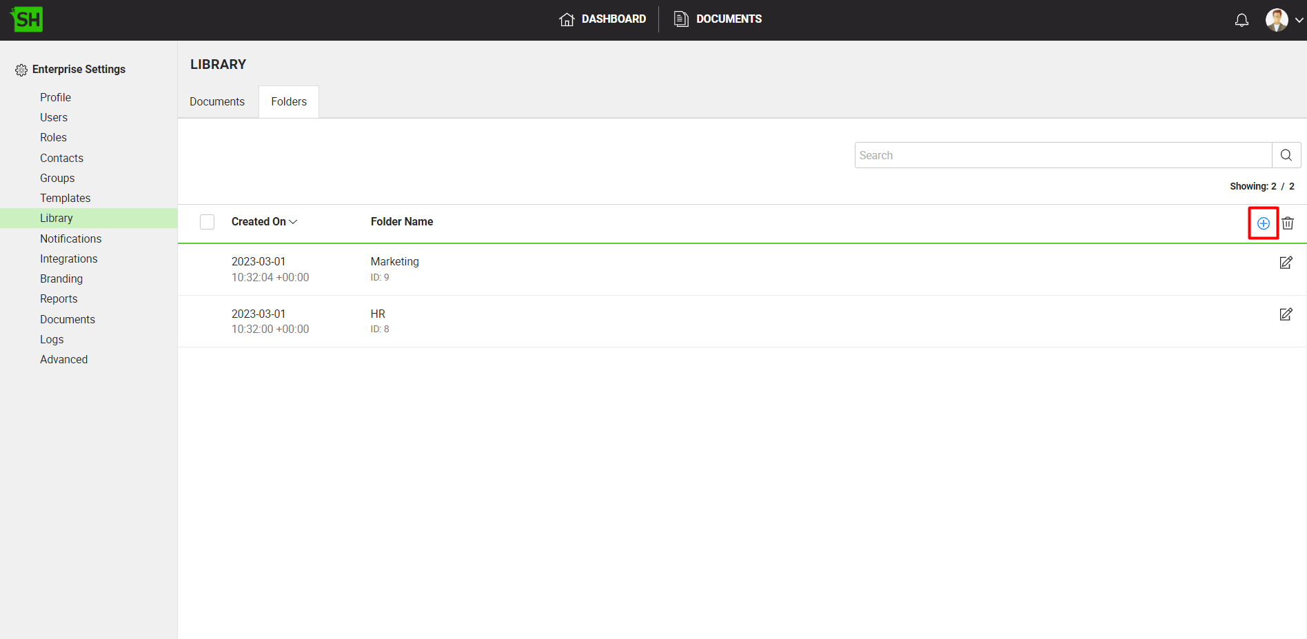 - Click on the "Folders" tab to view all the enterprise library document folders.