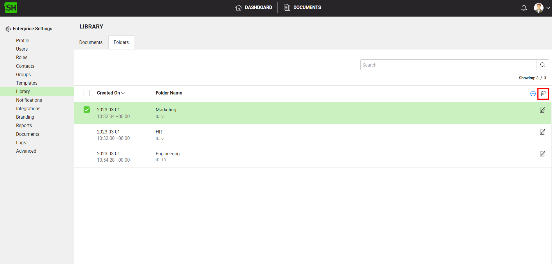 - Select the enterprise library document folder to delete click