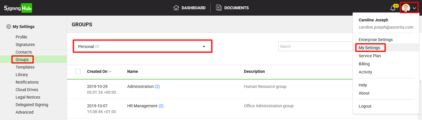 SigningHub enables you to create groups of your recipients for the group signing, group approving, and/ or group updating purposes. These groups are available to you, when you need to add recipients in a template and/or in a document workflow.