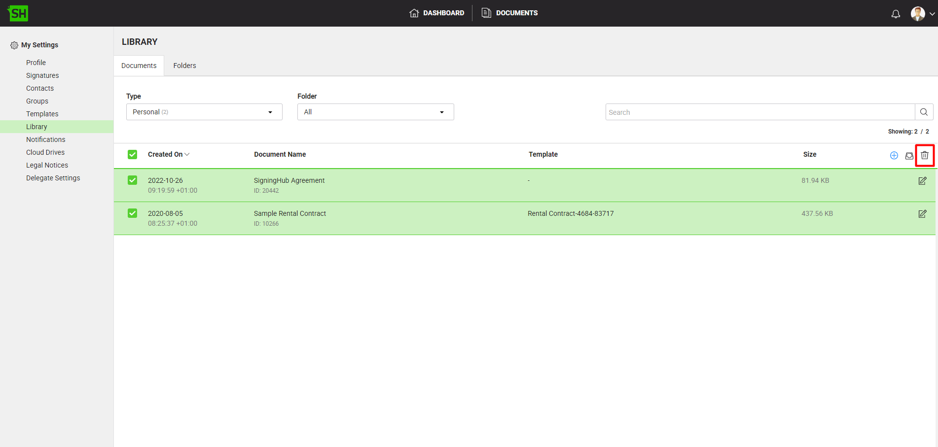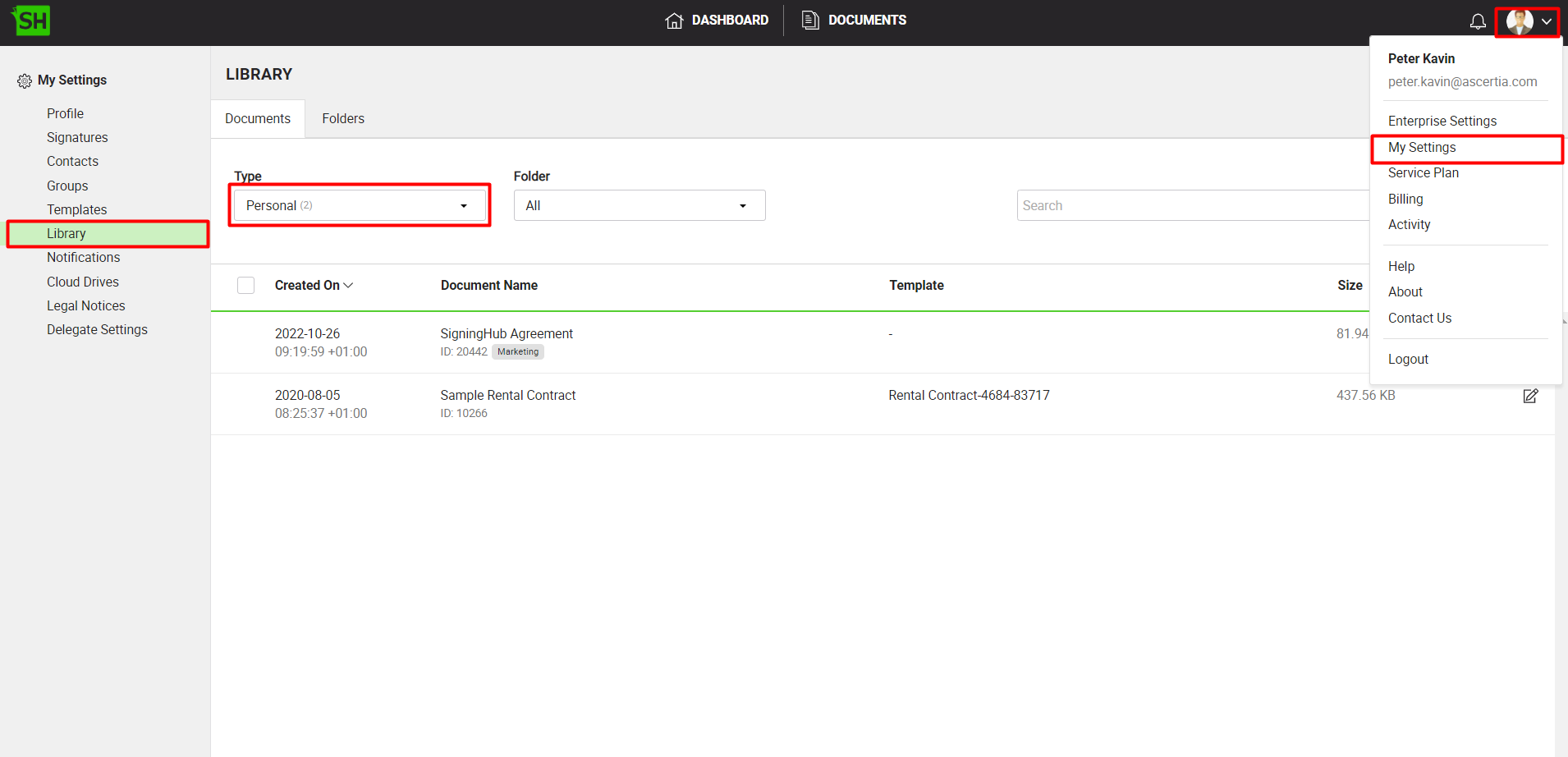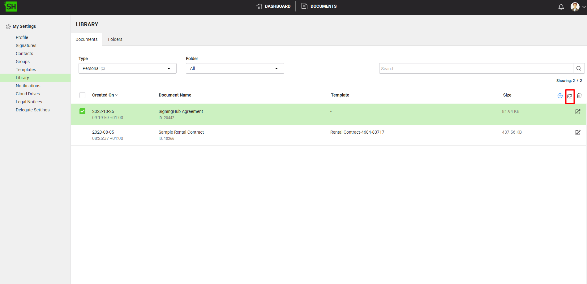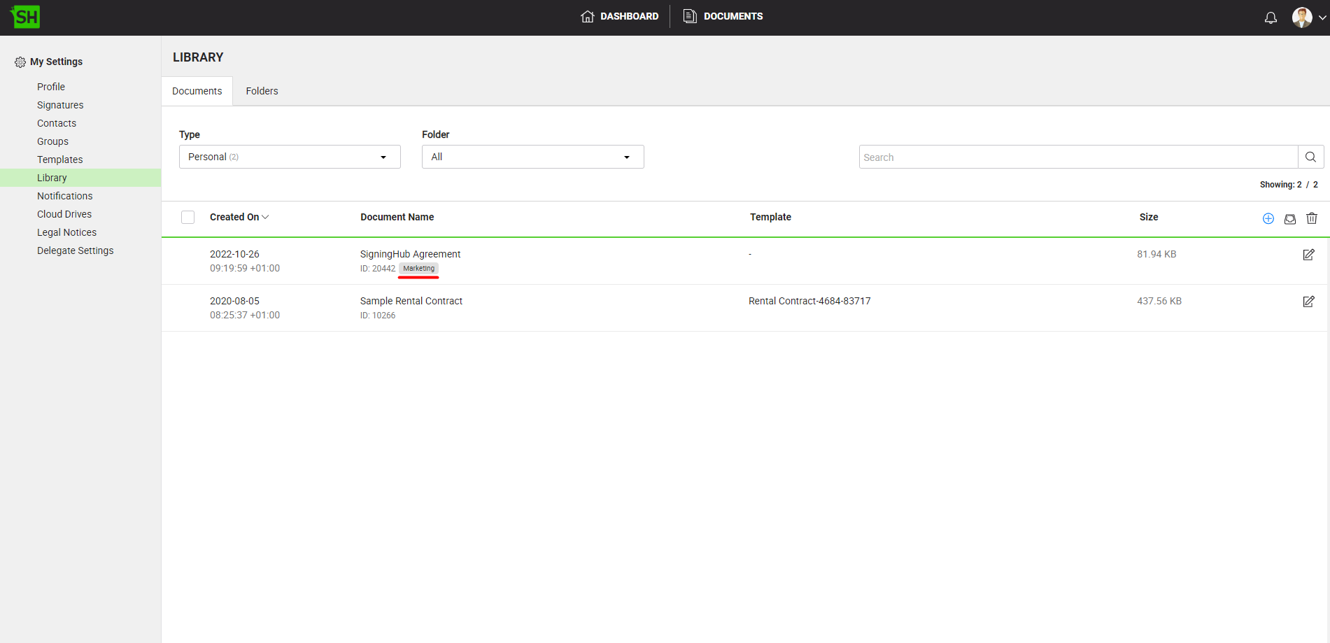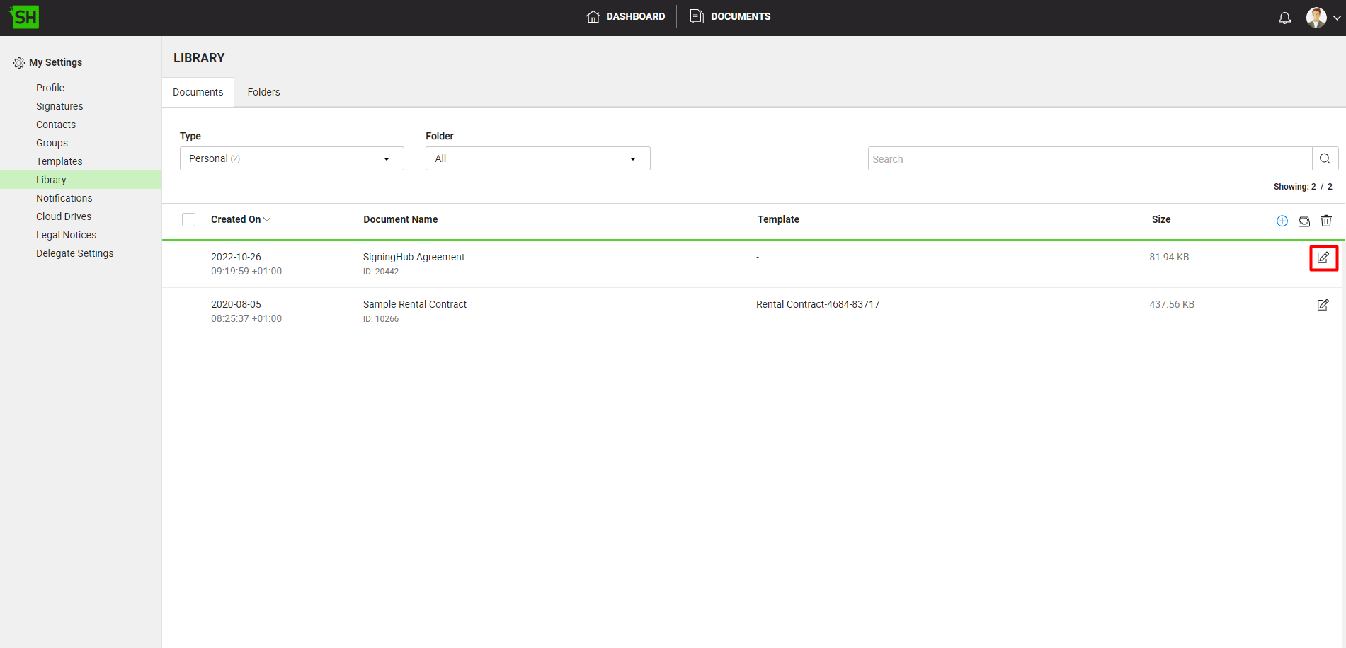 - Click the "Library" option from the left menu. Your existing personal documents will be listed.
