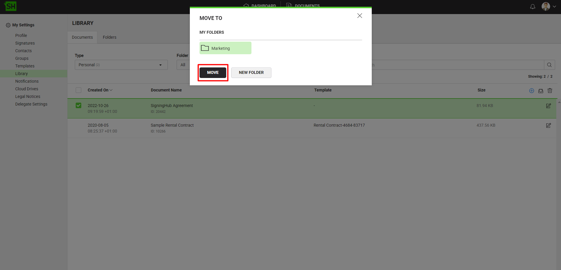 - Select the folder into which you want to move the document and click the "Move" button. If you want to create a new folder, click on the "New Folder" button.