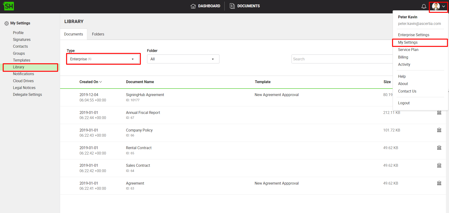The "Folder" drop down can be used if you want to view enterprise documents added to a specific folder. The "Folder" drop down will appear, if there is at least one enterprise library document folder created. The document with a configured template will be showing the template name next to it.